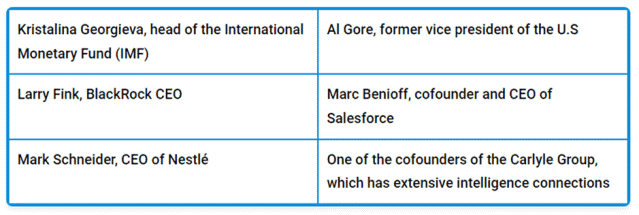 Many have heard of Klaus Schwab, WEF co-founder and chairman. But it’s also important to delve into WEF’s Board of Trustees, which is packed with powerful and prominent representatives from multinational corporations. It includes: