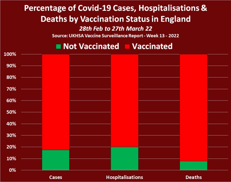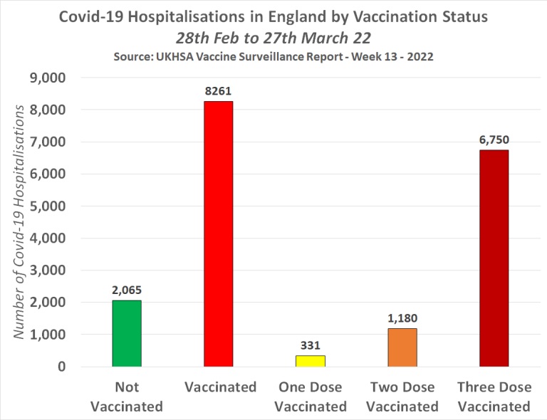 Overall, the vaccinated population accounted for 8,261 of the 10,326 covid hospitalisations, meaning they accounted for 80% of all covid-19 hospitalisations in England between 28th Feb and 27th March 22.