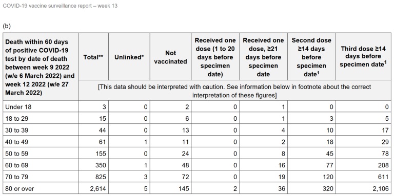 Table 13b, found on page 44 of the Week 13 report showed the number of covid-19 deaths by vaccination status in England between 28th Feb and 27th March 22, and it confirmed yet again the vast majority were recorded among the triple vaccinated population.