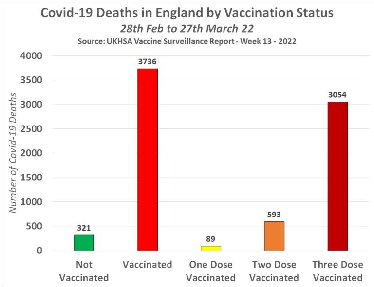 In all, there were 4,057 covid-19 deaths between 28th Feb and 27th March 22, and the triple vaccinated population accounted for 3,054 of them. Whilst the not-vaccinated population accounted for just 321.