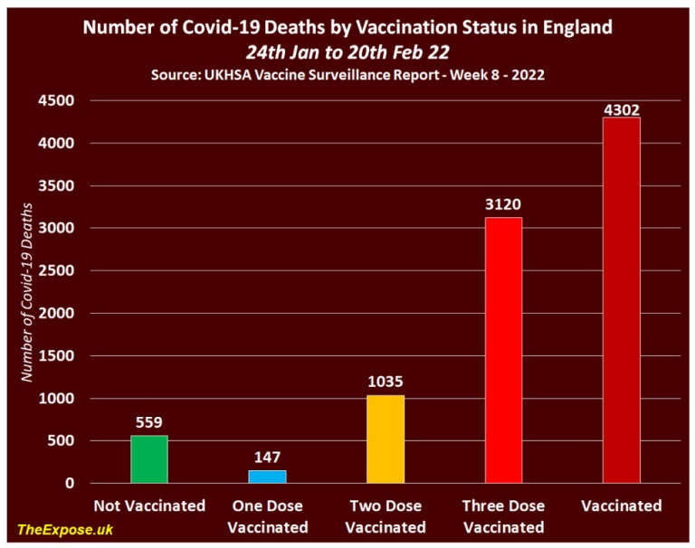 Official data published by the UK Health Security Agency confirmed the fully vaccinated population accounted for a shocking 92% of all covid-19 deaths across England throughout March, but what’s even more shocking is that 82% of those deaths were among the triple vaccinated population.