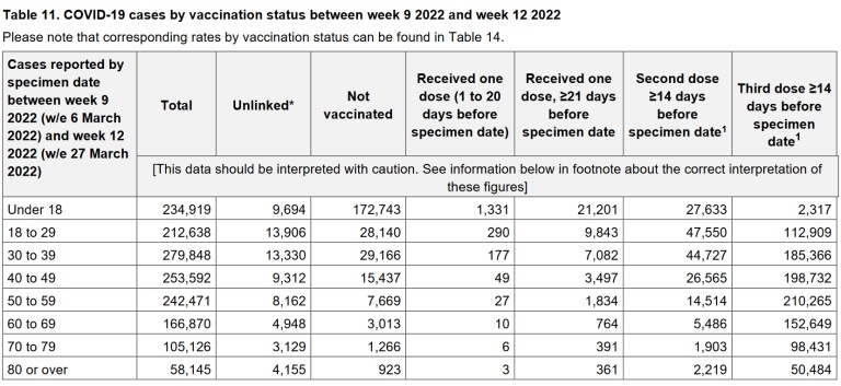 Table 11, found on page 41 of the latest report showed the number of Covid-19 cases by vaccination status in England between 28th Feb and 27th March 22, and it confirmed the vast majority were recorded among the triple vaccinated population.