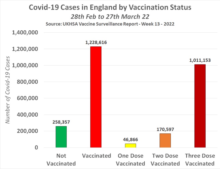 In all, between 28th Feb and 27th March, there were a total of 1,486,973 covid-19 cases recorded across England, and the triple vaccinated population accounted for an astounding 1,011,153 of them, whilst the not-vaccinated population accounted for just 258,357 cases.