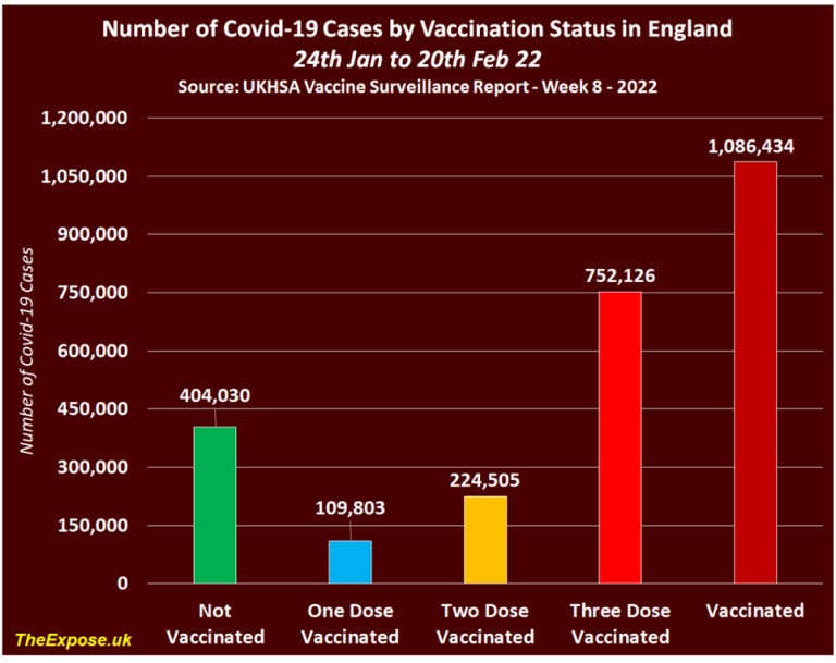 The following chart (see link) shows the number of covid-19 cases by vaccination status in England a month earlier between 24th Jan and 20th Feb 22, the data has been extracted from the Week 8 – 2022 Vaccine Surveillance Report.