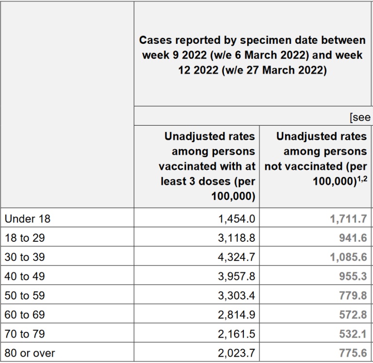 The following chart (link below) is from page 45 of the Week 13 Vaccine Surveillance Report and it shows the case-rate per 100,000 among the unvaccinated and triple vaccinated. The only age group where the case-rate per 100,000 is lower among the unvaccinated is the under 18’s, and about 95% of them are not even eligible for a third dose.