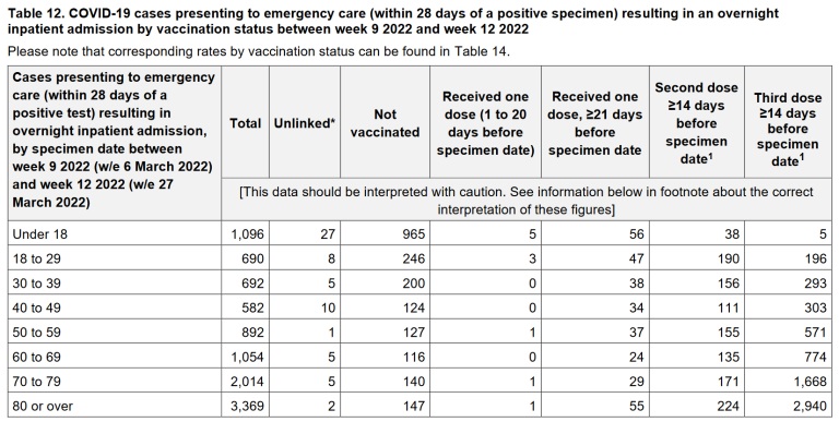 Table 12, found on page 42 of the Week 13 report shows the number of covid-19 hospitalisations by vaccination status in England between 28th Feb and 27th March 22, and it confirms the vast majority were again recorded among the triple vaccinated population.