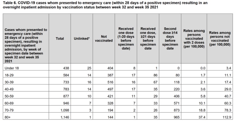 The following table was taken from Public Health England’s ‘Covid-19 Vaccine Surveillance Report – Week 36 – 2021’, and it showed that between week 32 and week 35 of 2021 (when Delta was the dominant variant) there were just 404 covid-19 hospitalisations recorded among under 18’s in England.