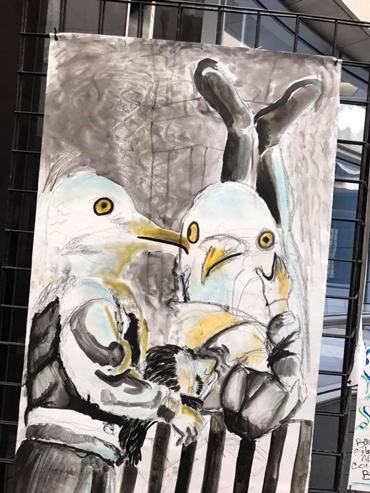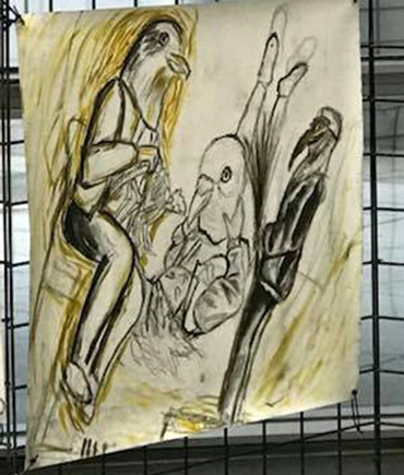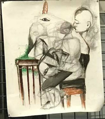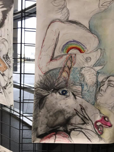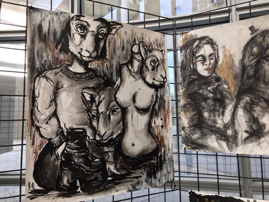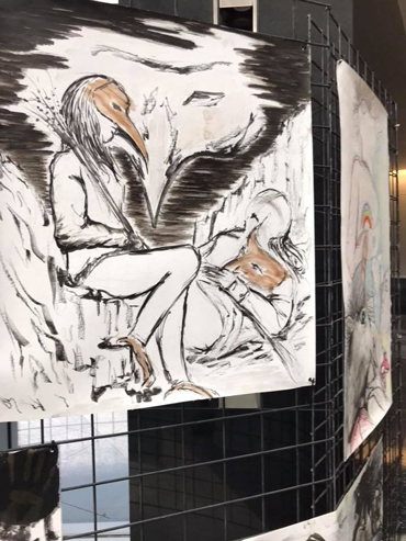 The series of paintings on display at the Lloyd George Federal Courthouse appear to tell a horrific story of ritual abuse. The main handler is represented by a unicorn (a phallic symbol) who is named “Evil King”. More abuse is committed by birds with human bodies. The fact that the abusers are animals probably alludes to the fact that dissociated slaves have little to no contact with reality. In all of the paintings, the slaves appear completely out of it or passed out.