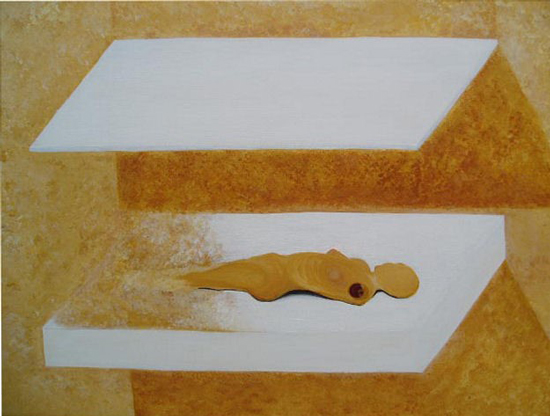 Kim Noble’s painting “Armless Goddess” portrays a hopelessly powerless figure, ironically referred to as a goddess.