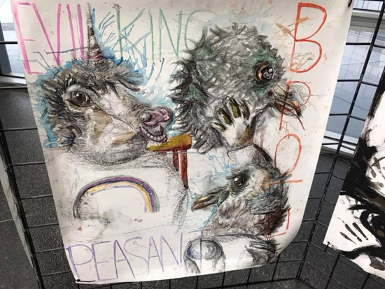 This painting depicts a unicorn under the words EVIL KING. On the right are two pigeons and the word BROTHER. Under the unicorn is a rainbow (a symbol of Monarch mind control) and the word PEASANT.