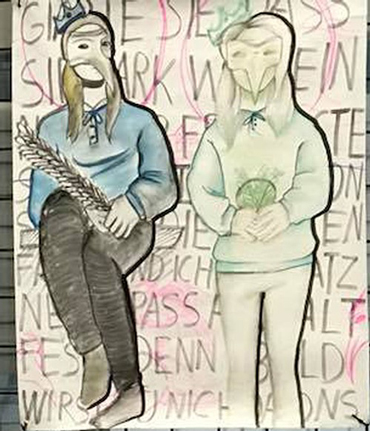 Two girls wearing plague masks and ironic crowns. Two victims.