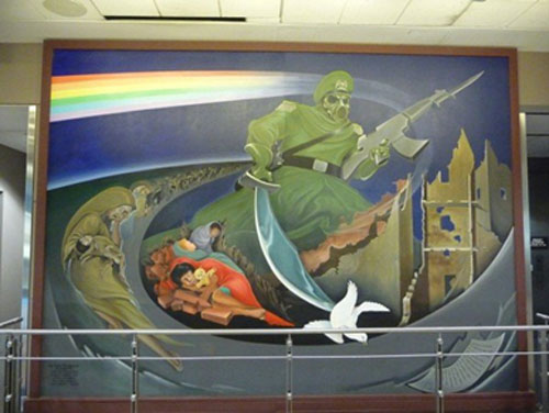 In the Framed video, he is a mind-controlled serial killer, murdering people and dismembering them, and all the while the local news media is giving him free press. It’s really quite messed up. Here’s a still from the video:
