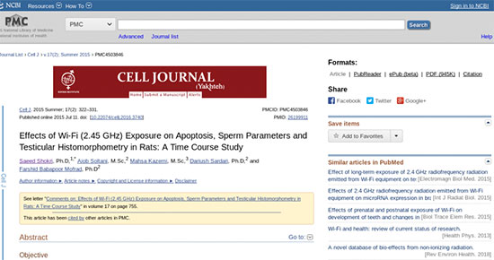 One study performed in Iran, published in the journal Cell in 2015 is titled “Effects of Wi-Fi (2.45 GHz) Exposure on Apoptosis, Sperm Parameters and Testicular Histomorphometry in Rats: A Time Course Study.”