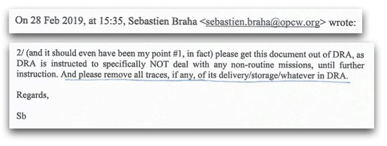 In one leaked email exchange, members of a fact-finding team that had deployed to the city and officials with the OPCW, Sebastien Braha, the watchdog agency’s Chief of Cabinet, ordered removal of “all traces” of a report written by an expert named Ian Henderson.
