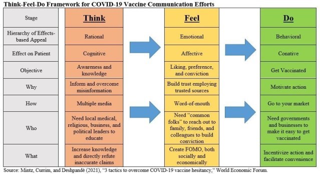 The World Economic Forum state that they “believe applying the ‘think – feel – do’ patient-centered approach to the covid-19 vaccine communication problem will improve efforts at accelerating global herd immunity. Ensuring a safe economic reopening and recovery and overcoming this significant health and economic challenge could depend on such tactics”.