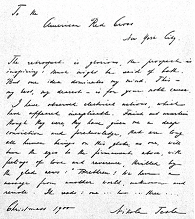 Above: Nikola Tesla’s actual Christmas Day 1900 hand written letter to the American Red Cross revealing his discovery of signals from space