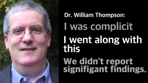His name is Dr. William Thompson, and he bravely told the world that it was “the lowest point” in his career that he “went along with that paper”. He said that the authors “didn’t report significant findings” and that he is “completely ashamed” of what he did, that he was “complicit and went along with this”, and that he regrets that he has “been part of the problem”.