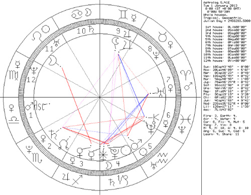 2. Jupiter sextile Uranus trine Mars, but Neptune has no relationship with the mutual reception Saturn-Pluto at the moment of the New Year, but much later in 2013.