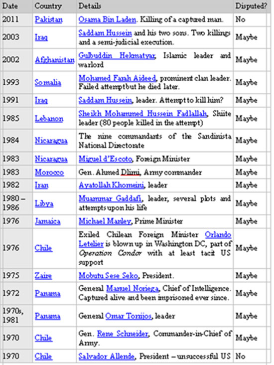 The US has made more than 50 attempts to assassinate political party leaders according to William Blum in his 2003 book Killing Hope: U.S. Military and C.I.A. Interventions since World War II. Noam Chomsky called this book “Far and away the best book on the topic”. Former CIA officer John Stockwell called the same book “The single most useful summary of CIA history.”