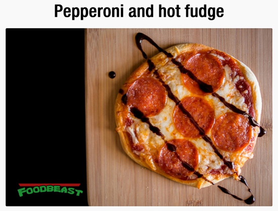 This video contains a montage of many of the strange pizzas that were made. Many of them include unusual sauces. These sauces include butterscotch, clam sauce, chocolate fudge sauce, whipped cream, hot fudge, yogurt and anchovy sauce.