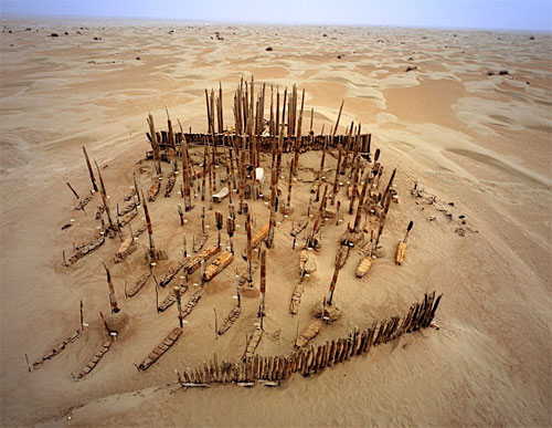 În extremitatea estică a deșertului Taklamakan, China, la sute de kilometri de cea mai apropiată așezare, o grămadă imensă de stâlpi din lemn înfipți în nisip marchează locul unui cimitir vechi de 4.000 de ani. Deși cimitirul se află în nord-vestul Chinei, rămășițele descoperite aici prezintă trăsături europene, fapt ce adâncește și mai mult misterul acestor oameni, care cu mii de ani în urmă au ales sau au fost forțați să locuiască în mijlocul unui pustiu lipsit de apă și implicit de terenuri fertile. Deșertul Taklamakan este cel mai mare din China și este al doilea deșert cu nisipuri mișcătoare al lumii. Acesta se întinde pe o suprafață de 33.700 de kilometri pătrați. În limba uigur, Taklamakan înseamnă „poți intra dar nu mai poți ieși”.