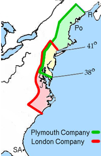 • Compania Virginia este alcătuită din două filiale: London Company şi Playmouth sau New England Company. Prima era responsabilă de prima colonie permanentă din America de la Jamestown, creată la data de 14 mai 1607, iar cea de-a doua de aşa-numiţii „Părinţi Pelerini” care au sosit la Cape Cod pe nava Mayflower în noiembrie 1620, debarcând în Plymouth Harbour pe data de 21 decembrie. „Pelerinii” din mitul istoriei americane sunt de fapt membrii celei de-a doua filiale a Companiei Virginia, numită New England Company.