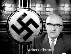 Walter Hallstein, „arhitectul cheie al Uniunii Europene” a fost un jurist puternic în Germania nazistă, însărcinat cu formularea legii pentru „protecţia sângelui german şi a onoarei germane”, în 1939. El, Hallstein, fusese instruit de profesori de drept al căror prim scop era sabotarea Tratatului de la Versailles, care a decis cheltuielile de reparaţii impuse Germaniei după pierderea Primului Război Mondial, cât timp a studiat la Kaizer Wilhelm Institute din Berlin, instituţie privată finanţată de cartelul IG Farben. În iunie 1938, Hallstein participase la negocierile oficiale de stat între Germania nazistă şi Italia fascistă în scopul de a crea, pe baza politicilor lor, o platformă pentru Europa viitoare. În 1941, Hallstein a devenit decan al Facultăţii de Drept şi Economie de la Universitatea din Frankfurt, Germania, unde îşi avea sediul, de asemenea, IG Farben. Câţiva ani mai târziu, Tribunalul pentru crime de război de la Nürnberg susţinea că în acest sediu al IG Farben s-a planificat şi implementat cucerirea economică a Europei.