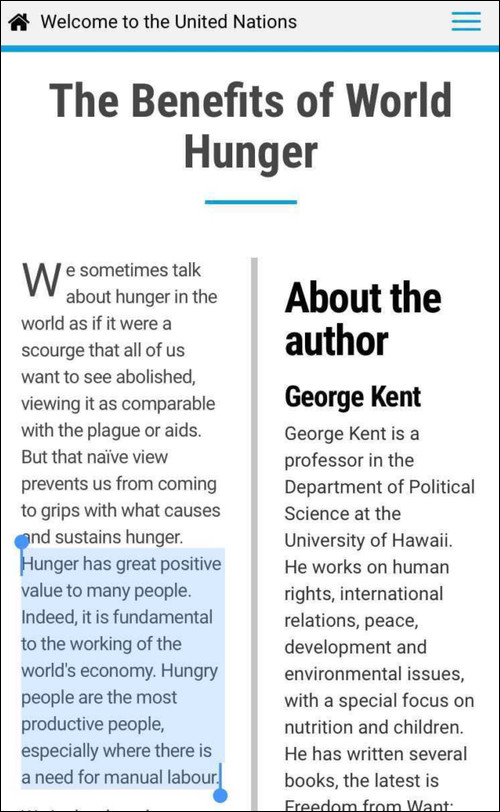 Tipii de la ONU au încetat să mai distrugă lumea pentru câteva minute, pentru a publica un articol (captură de ecran mai jos) în care își justifică comportamentul explicând „beneficiile” foametei pe care au creat-o.