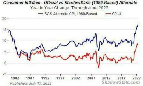 Iar asta spune ceva, deoarece, după cum știți, modul în care se măsoară IPC este, bineînțeles, o prostie totală și reprezintă aproximativ jumătate din rata reală. Puteți consulta Shadowstats al lui John Williams, unde inflația din SUA este calculată pe baza metodologiei utilizate în anii ’80 (înainte de fraudă). Tocmai a ajuns la 17,3%. Asta înseamnă un pic mai mult decât tiparul de 9,1% cu care tocmai au încercat să vă prostească.