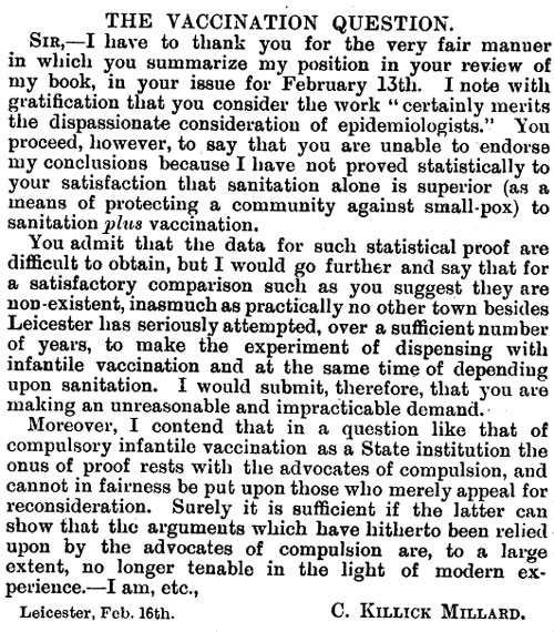 If it can be shown that ‘sanitation’, thoroughly carried out, is alone sufficient for the effective control of smallpox in this country (as in Leicester), why inflict upon the community universal vaccination with all its inseparable drawbacks? Moreover, what justification can there be any longer for compulsion?