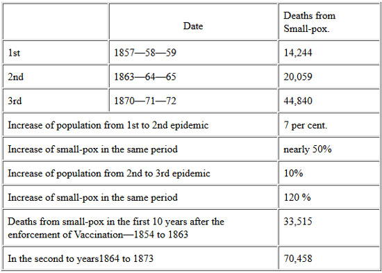 In Compulsory Vaccination in England (1884), social reformer William Tebb observed: “Vaccination was made compulsory by an Act of Parliament in the year 1853; again in 1867; and still more stringent in 1871. Since 1853, we have had three epidemics of small-pox, each being more severe than the one preceding.”