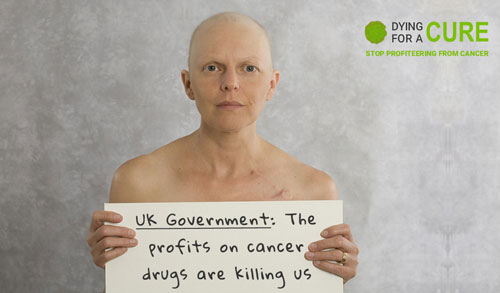 To promote the campaign and encourage users to sign his petition, the father-of-two from West Horsley used an image of a cancer patient with a scar near her collarbone from the cancer treatment. In the picture, the woman is holding a sign over her bare chest with the slogan: UK Government: The profits on cancer drugs are killing us.