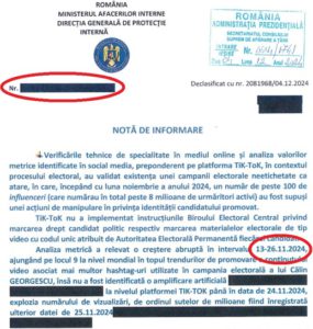 Dacă luăm însă primul document SRI din cele două furnizate CSAT, vom observa că are data de înregistrare 28.11.2024 dar, logic, el a fost elaborat pe 27.11.2024, pentru că nu ne închipuim că întregul lanț de documentare, concepere și aprobare a materialului s-a derulat pe super-repede-înainte în dimineața zilei de joi, 28.11.2024. Captura 2: