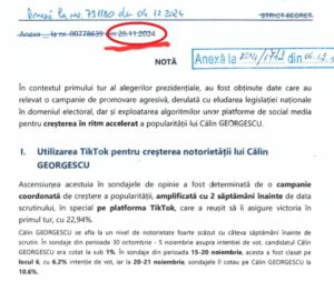 Dar chiar așa fiind, cum ar putea să explice cineva – SRI, Administrația Prezidențială, Comisiile de Control specifice ale Parlamentului, o mult așteptată Comisie de Anchetă a Parlamentului, încă neînființată, după 4 luni de la lovitura de stat – datele următoare din documentul chipurile elaborat pe 27.11.2024 (sau chiar mai devreme – conform afirmațiilor președintelui Iohannis evidențiate mai sus) și depus la CSAT pe 28.11.2024, și anume: