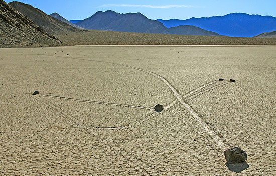 8. Racetrack Playa este o regiune deşertică, aflată în nord-vestul celebrei Văi a Morţii din California, plină de pietre care se mişcă şi care lasă în urma lor o dâră pe nisip.
