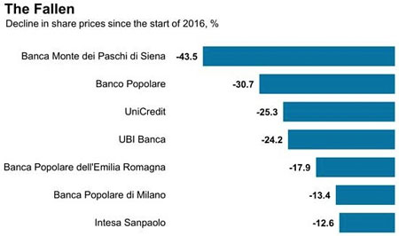 Şi iată că, în acest fel, am ajuns şi la bănci şi la „materia lor primă”, adică banii! Pentru că, acum, scenariul filmului apocaliptic are în prim-plan bursele, iată că primele ştiri dramatice nu mai sunt oferite de bănci (în mod aparent), aşa cum se petrecea în 2008 şi 2009. Cu toate acestea, observăm cum, de curând, au început să curgă informaţii despre cea mai fragilă structură bancară naţională, care se evidenţiază a fi, momentan, în Italia.