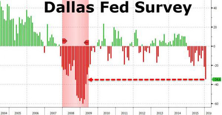 Iar aceste studii interne realizate în mod direct de FED nu se bazează doar pe comparaţii cu anii 1930 şi prognoze foarte bine documentate, ci şi pe evoluţia indicilor FED-urilor regionale (cele 12 Bănci Regionale, numite Regional Federal Rezerve Banks), în care, spre exemplu, Fed-ul Regiunii Dallas ne arată cum evoluţia pieţei a avut o creştere negativă în cursul anului trecut, 2015, cu o prăbuşire a valorilor începând cu ianuarie 2016, la cifre tot mai apropiate (la aproximativ o treime) de minimele de la finele anului 2008 şi începutul lui 2009.