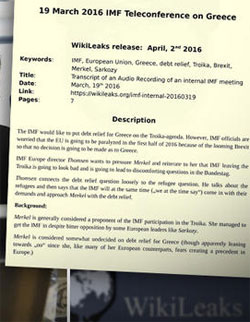 Wikileaks a publicat ceea ce organizația prezintă a fi o transcriere a unei conferinţe telefonice ce a avut loc la 19 martie mai ales între Poul Thomsen, şeful departamentului pentru Europa al Fondului, şi Delia Velculescu, şefa misiunii FMI pentru Grecia.