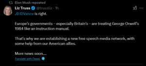 „J.D.Vance are dreptate. Guvernele europene – în special cele britanice – tratează 1984 al lui George Orwell ca pe un manual de instrucțiuni. De aceea creăm o nouă rețea media pentru libertatea de exprimare, cu ajutorul aliaților noștri americani.