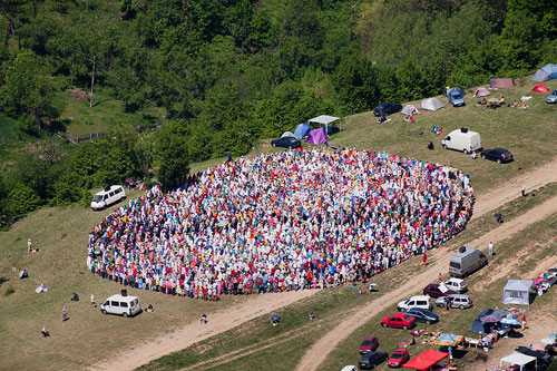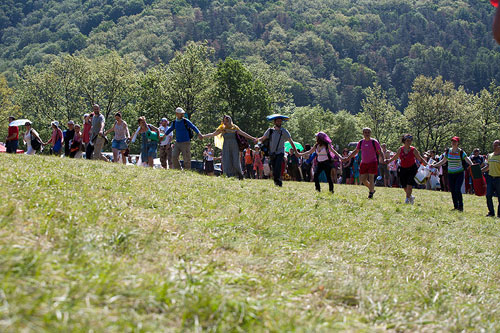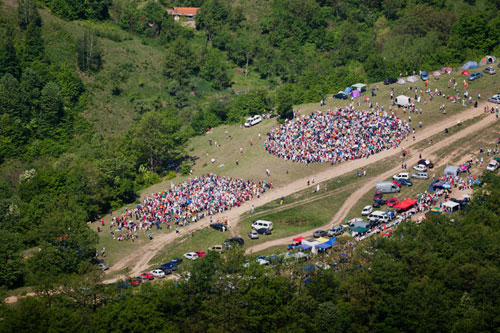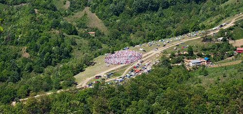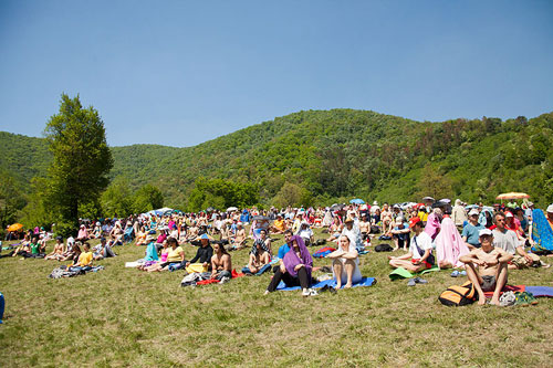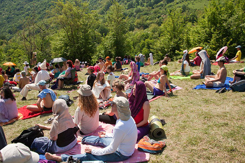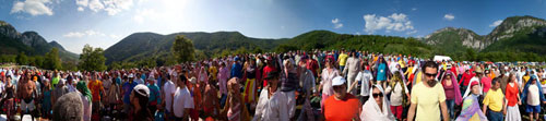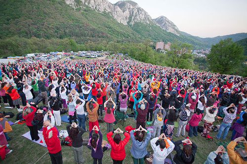 În centrul imaginii de mai jos, realizată de pe versantul opus, ceea ce pare un micuţ grup de oameni este de fapt o spirală yoghină cu peste 2000 de participanţi.