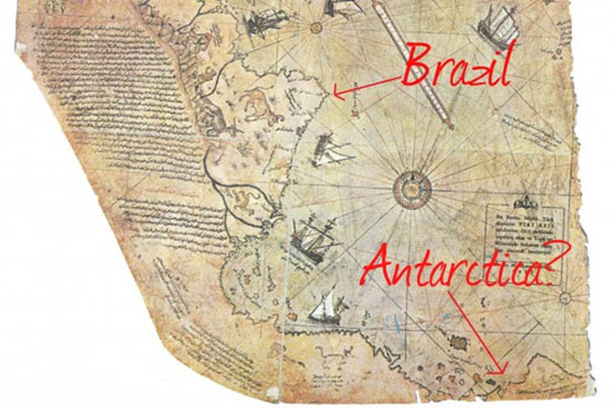 Une carte créée par l’amiral et cartographe turc Piri Reis en 1513 en reprenant des éléments de différentes cartes antérieures. Elle est censée représenter l’Antarctique à une époque où il n’était pas encore recouvert de glace. Une masse est représentée au bout de la côte méridionale de l’Amérique du Sud. Le capitaine Lorenzo W. Burroughs, capitaine de l’US Air Force dans la section cartographie, a écrit une lettre au Dr Charles Hapgood en 1961 disant que cette masse semble montrer précisément la côte de l’Antarctique qui est sous la glace.