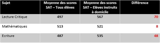Début juin, Dr. Brian Ray du National Home Education Research Institute a publié des résultats sur la façon dont les élèves instruits à domicile se comparent face à d’autres étudiants sur le SAT. Les résultats dans le tableau ci-dessous montrent que les élèves instruits à domicile surperforment de loin leurs camarades de l’école traditionnelle, particulièrement dans les domaines de lecture et d’écriture.