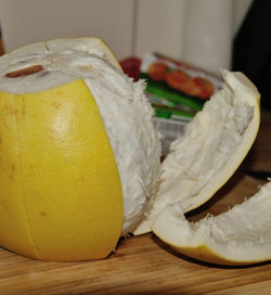Le goût est, cependant, est assez agréable, avec la texture des pamplemousses, sans la saveur acidulée ou aigre. Il est généralement de couleur vert pâle ou jaune, tandis que sa chair interne comestible est pulpeuse et blanche (ou, plus rarement, rose ou rouge). L’histoire de son utilisation remonte à quelques centaines d’années, bien qu’il fût probablement cultivé pendant beaucoup plus longtemps que cela, dans certains pays d’Asie du Sud-Est. C’est principalement dans ces endroits-là que vous trouverez des pomelos sur le marché, à l’exeption de certaines épiceries spécialisées dans le domaine occidental.