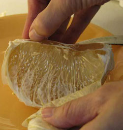 Les pomelos ne sont pas les fruits des plus faciles à manger au monde, en fonction de l’épaisseur de leurs écorces, mais l’une des meilleures façons de commencer, c’est de couper la « capuche » du fruit, puis de trancher verticalement sur les côtés du fruit. Tirez l’écorce épaisse vers le bas et loin de l’intérieur charnu, qui devrait maintenant, beaucoup plus, ressembler à une orange. Retirez les parties charnues et ainsi que les graines. Une partie du tissu fibreux qui se trouve autour de la chair peut être amère, afin de l’enlever ou mettez-y un peu de sucre. Prenez plaisir !