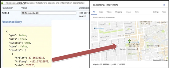 Le service Wigle permet de connaitre une adresse physique à partir de l’adresse MAC