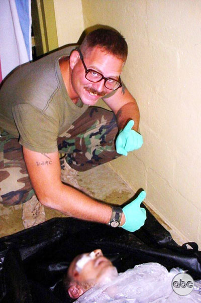 Des photos montrant les sévices ou humiliations subis par les détenus en Irak, comme ici Charles Garner souriant devant le corps d’un détenu mort à la prison d’Abou Ghraïb le 19 mai 2004, ont déjà été diffusées.