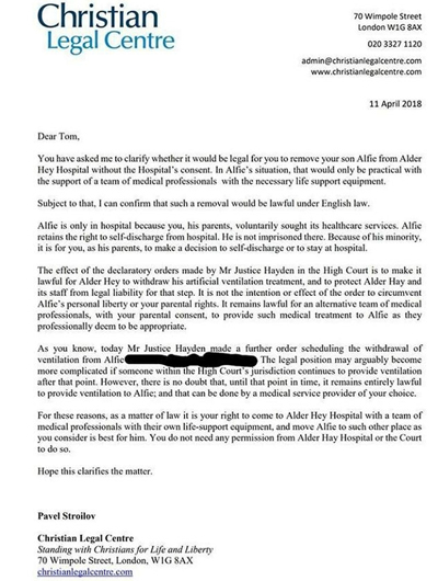 Pire. L’hôpital a appelé la police pour bloquer toutes les issues afin d’empêcher une opération de force en cas de tentative d’enlèvement du bébé. Pourtant, les parents d’Alfie avaient juridiquement le droit de faire sortir leur enfant et le faire soigner dans un autre établissement (voir lettre ci-dessous). Le père avait signé une décharge pour enlever toute responsabilité de l’hôpital en cas de problème lors du transfert et les services sociaux avaient a posteriori fait une demande d’ordonnance de protection, ce qui démontrait qu’ils ne pouvaient juridiquement pas empêcher ce transfert sans cette ordonnance.