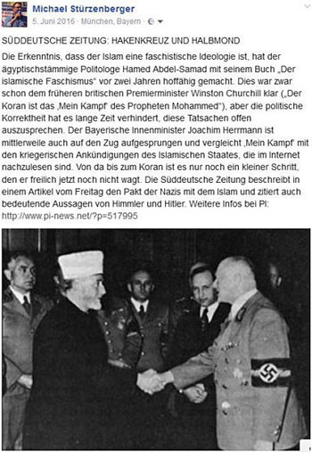 En août 2017, le tribunal d’instance de Munich a condamné le journaliste Michael Stürzenberger à six mois d’emprisonnement avec sursis pour avoir publié sur sa page Facebook une photo du grand mufti de Jérusalem, Haj Amin al-Husseini, serrant la main d’un haut dignitaire nazi à Berlin en 1941. Le procureur a accusé Stürzenberger d’avoir « incité à la haine contre l’islam » et d’avoir « dénigré l’islam ». Le tribunal a déclaré Stürzenberger coupable de « diffusion de propagande d’organisations anticonstitutionnelles ». En décembre 2017, la cour d’appel de Munich a acquitté Stürzenberger de toutes les charges qui avaient été retenues contre lui. Les juges d’appel ont estimé que ses propos étaient protégés par lois qui fondent la liberté d’expression. Néanmoins, l’impression demeure aujourd’hui dans la société allemande que même les faits historiques sont devenus tabous.