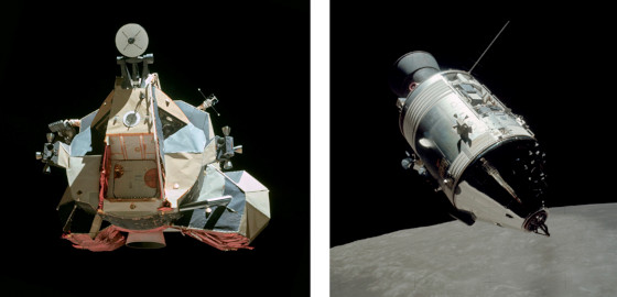 Ci-dessous à droite, le même étage supérieur du module lunaire d’Apollo 17 en papier mâché, avec sa trappe de pressurisation en carton, photographié par Ronald Evans depuis le module de commande orbitant autour de la lune. À gauche, ce module de commande, photographié depuis le module lunaire (depuis quel hublot ?) avant amarrage des deux modules.[10]