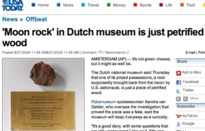 Alors, la NASA peut-elle fournir des preuves tangibles des alunissages ? Bien sûr ! Il y a toutes ces roches patiemment ramassées par nos astronautes. Certes, l’une d’elles s’est révélée être du bois pétrifié[26], mais admettons que ce petit « canular lunaire » avéré ne prouve pas le grand Moon Hoax.